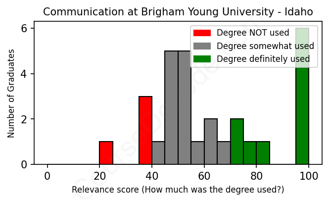 The verdict? Slightly below average. Overall, with an average relevance score of 62%, Communication graduates from Brigham Young University - Idaho have a slightly lower likelihood (-5%) of finding work in this field compared to the average graduate across all fields: