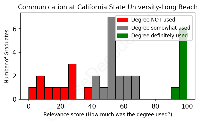 The verdict? Significantly below average. Overall, with an average relevance score of 51%, Communication graduates from California State University-Long Beach have a much lower likelihood (-16%) of finding work in this field compared to the average graduate across all fields: