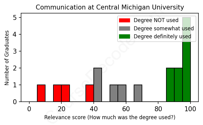 The verdict? Slightly below average. Overall, with an average relevance score of 66%, Communication graduates from Central Michigan University have a slightly lower likelihood (-1%) of finding work in this field compared to the average graduate across all fields: