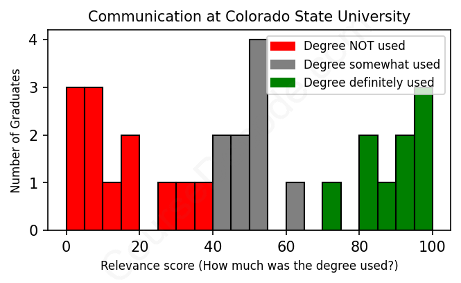 The verdict? Significantly below average. Overall, with an average relevance score of 47%, Communication graduates from Colorado State University have a much lower likelihood (-20%) of finding work in this field compared to the average graduate across all fields: