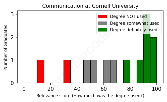 The verdict? Slightly above average. Overall, with an average relevance score of 69%, Communication graduates from Cornell University have a slightly higher likelihood (+2%) of finding work in this field compared to the average graduate across all fields: