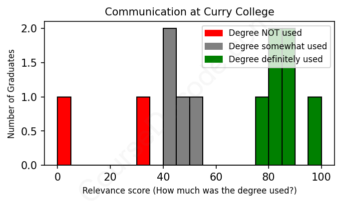The verdict? Below average. Overall, with an average relevance score of 60%, Communication graduates from Curry College have a lower likelihood (-7%) of finding work in this field compared to the average graduate across all fields: