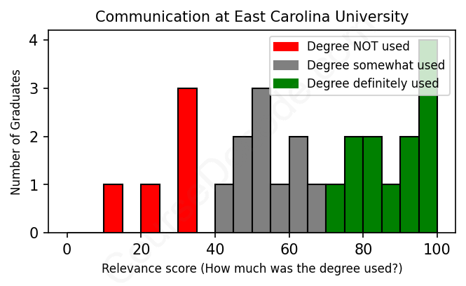 The verdict? Slightly below average. Overall, with an average relevance score of 63%, Communication graduates from East Carolina University have a slightly lower likelihood (-4%) of finding work in this field compared to the average graduate across all fields: