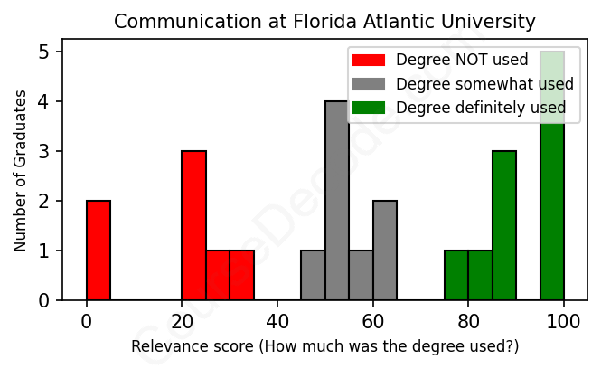 The verdict? Below average. Overall, with an average relevance score of 59%, Communication graduates from Florida Atlantic University have a lower likelihood (-8%) of finding work in this field compared to the average graduate across all fields: