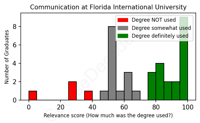 The verdict? Slightly above average. Overall, with an average relevance score of 70%, Communication graduates from Florida International University have a slightly higher likelihood (+3%) of finding work in this field compared to the average graduate across all fields: