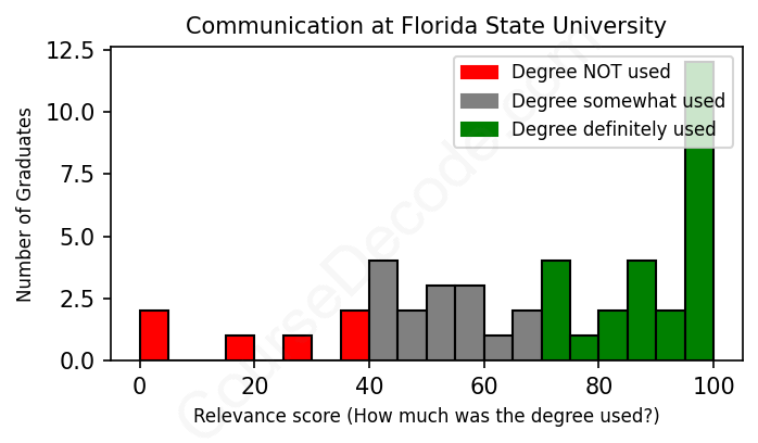 The verdict? Slightly above average. Overall, with an average relevance score of 68%, Communication graduates from Florida State University have a slightly higher likelihood (+1%) of finding work in this field compared to the average graduate across all fields: