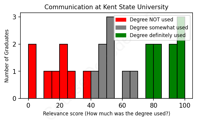 The verdict? Significantly below average. Overall, with an average relevance score of 54%, Communication graduates from Kent State University have a much lower likelihood (-13%) of finding work in this field compared to the average graduate across all fields: