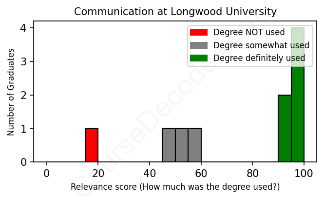 The verdict? Above average. Overall, with an average relevance score of 75%, Communication graduates from Longwood University have a higher likelihood (+8%) of finding work in this field compared to the average graduate across all fields:
