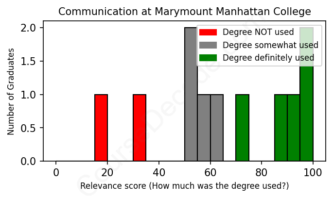 The verdict? Slightly below average. Overall, with an average relevance score of 65%, Communication graduates from Marymount Manhattan College have a slightly lower likelihood (-2%) of finding work in this field compared to the average graduate across all fields: