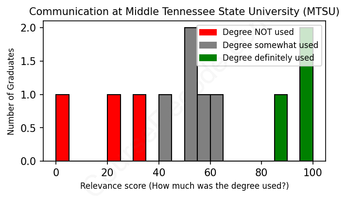The verdict? Significantly below average. Overall, with an average relevance score of 55%, Communication graduates from Middle Tennessee State University (MTSU) have a much lower likelihood (-12%) of finding work in this field compared to the average graduate across all fields: