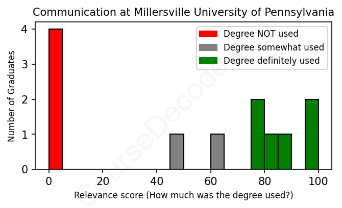 The verdict? Significantly below average. Overall, with an average relevance score of 53%, Communication graduates from Millersville University of Pennsylvania have a much lower likelihood (-14%) of finding work in this field compared to the average graduate across all fields: