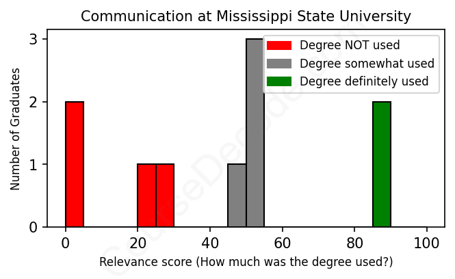 The verdict? Bad. Overall, with an average relevance score of 42%, Communication graduates from Mississippi State University have a substantially lower likelihood (-25%) of finding work in this field compared to the average graduate across all fields: