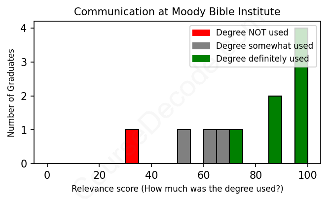 The verdict? Above average. Overall, with an average relevance score of 77%, Communication graduates from Moody Bible Institute have a higher likelihood (+10%) of finding work in this field compared to the average graduate across all fields: