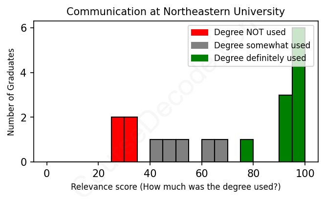 The verdict? Slightly above average. Overall, with an average relevance score of 70%, Communication graduates from Northeastern University have a slightly higher likelihood (+3%) of finding work in this field compared to the average graduate across all fields: