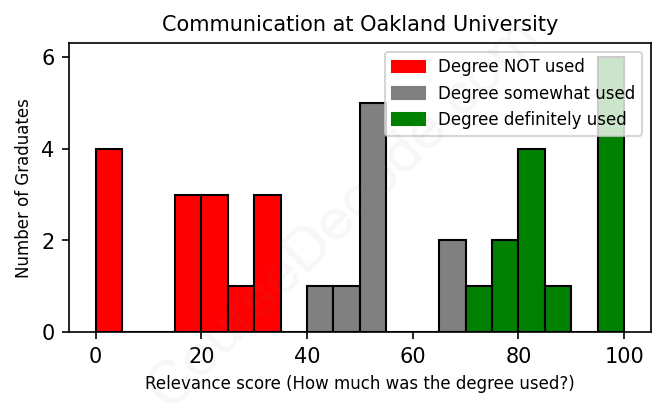 The verdict? Significantly below average. Overall, with an average relevance score of 52%, Communication graduates from Oakland University have a much lower likelihood (-15%) of finding work in this field compared to the average graduate across all fields:
