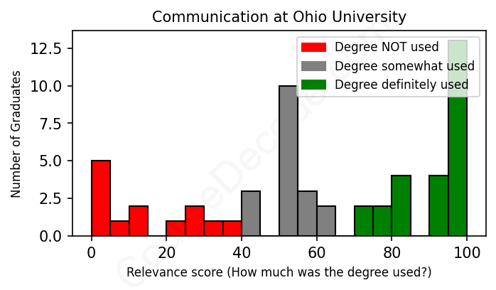 The verdict? Below average. Overall, with an average relevance score of 60%, Communication graduates from Ohio University have a lower likelihood (-7%) of finding work in this field compared to the average graduate across all fields: