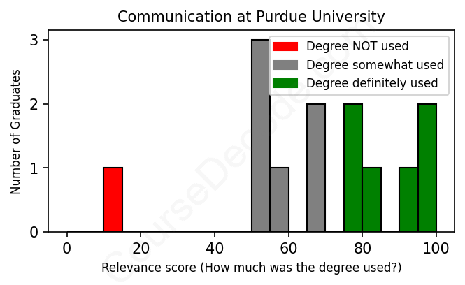 The verdict? Slightly above average. Overall, with an average relevance score of 68%, Communication graduates from Purdue University have a slightly higher likelihood (+1%) of finding work in this field compared to the average graduate across all fields: