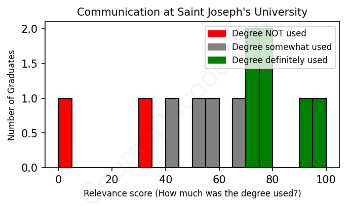 The verdict? Below average. Overall, with an average relevance score of 61%, Communication graduates from Saint Joseph's University have a lower likelihood (-6%) of finding work in this field compared to the average graduate across all fields: