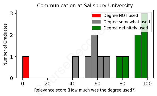 The verdict? Slightly above average. Overall, with an average relevance score of 69%, Communication graduates from Salisbury University have a slightly higher likelihood (+2%) of finding work in this field compared to the average graduate across all fields: