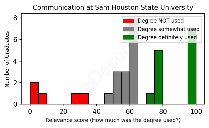 The verdict? Slightly below average. Overall, with an average relevance score of 63%, Communication graduates from Sam Houston State University have a slightly lower likelihood (-4%) of finding work in this field compared to the average graduate across all fields: