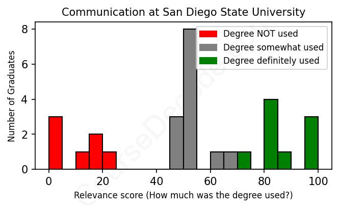 The verdict? Significantly below average. Overall, with an average relevance score of 52%, Communication graduates from San Diego State University have a much lower likelihood (-15%) of finding work in this field compared to the average graduate across all fields: