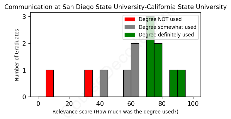 The verdict? Slightly below average. Overall, with an average relevance score of 62%, Communication graduates from San Diego State University-California State University have a slightly lower likelihood (-5%) of finding work in this field compared to the average graduate across all fields: