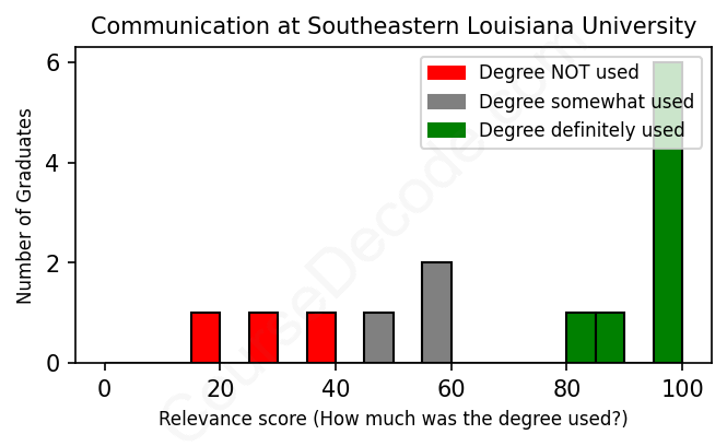 The verdict? Slightly above average. Overall, with an average relevance score of 71%, Communication graduates from Southeastern Louisiana University have a slightly higher likelihood (+4%) of finding work in this field compared to the average graduate across all fields: