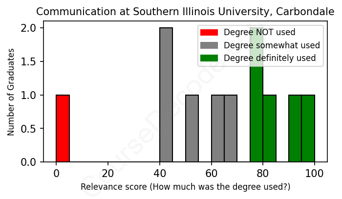 The verdict? Slightly below average. Overall, with an average relevance score of 63%, Communication graduates from Southern Illinois University, Carbondale have a slightly lower likelihood (-4%) of finding work in this field compared to the average graduate across all fields: