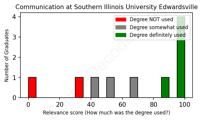 The verdict? On par with the average. Overall, with an average relevance score of 67%, Communication graduates from Southern Illinois University Edwardsville have about the same likelihood of finding work in this field as the average graduate across all fields: