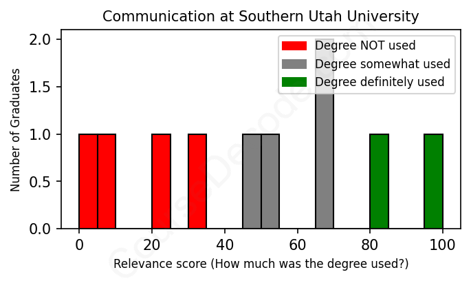 The verdict? Significantly below average. Overall, with an average relevance score of 52%, Communication graduates from Southern Utah University have a much lower likelihood (-15%) of finding work in this field compared to the average graduate across all fields: