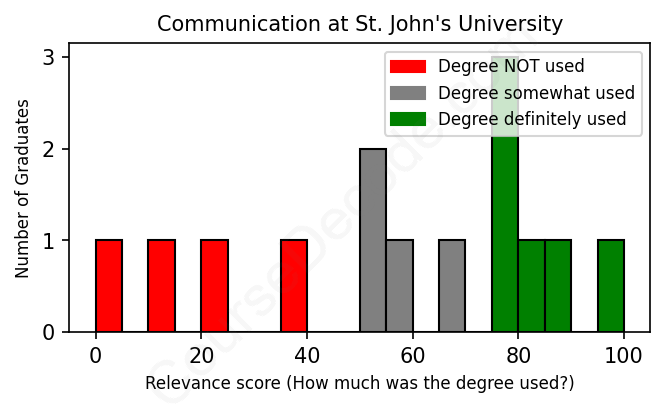 The verdict? Significantly below average. Overall, with an average relevance score of 56%, Communication graduates from St. John's University have a much lower likelihood (-11%) of finding work in this field compared to the average graduate across all fields: