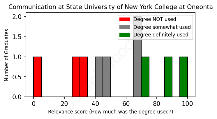 The verdict? Significantly below average. Overall, with an average relevance score of 53%, Communication graduates from State University of New York College at Oneonta have a much lower likelihood (-14%) of finding work in this field compared to the average graduate across all fields: