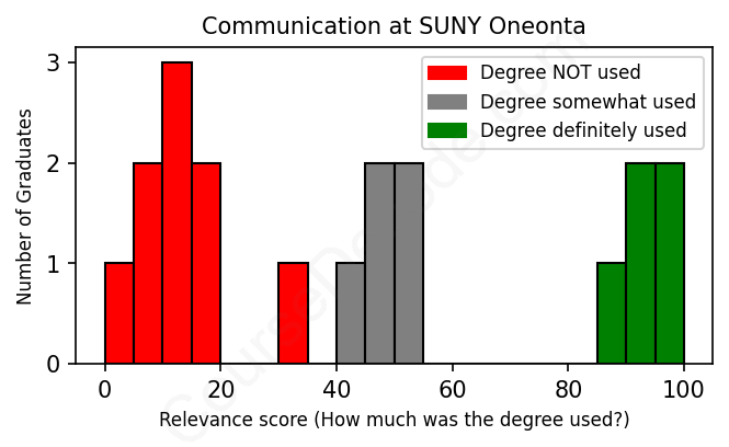 The verdict? Bad. Overall, with an average relevance score of 43%, Communication graduates from SUNY Oneonta have a substantially lower likelihood (-24%) of finding work in this field compared to the average graduate across all fields: