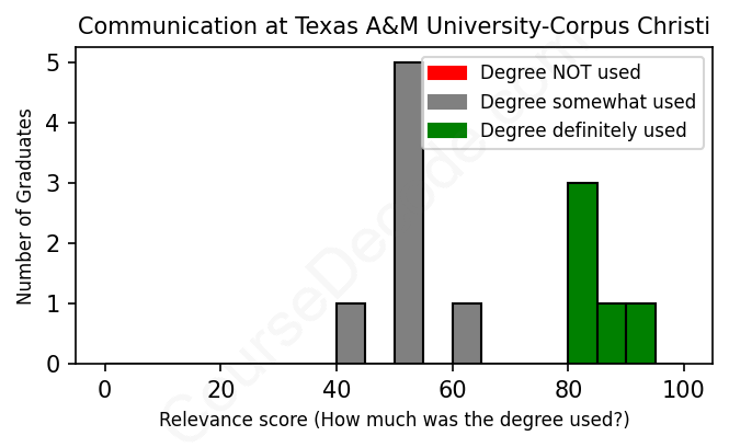 The verdict? Slightly below average. Overall, with an average relevance score of 65%, Communication graduates from Texas A&M University-Corpus Christi have a slightly lower likelihood (-2%) of finding work in this field compared to the average graduate across all fields: