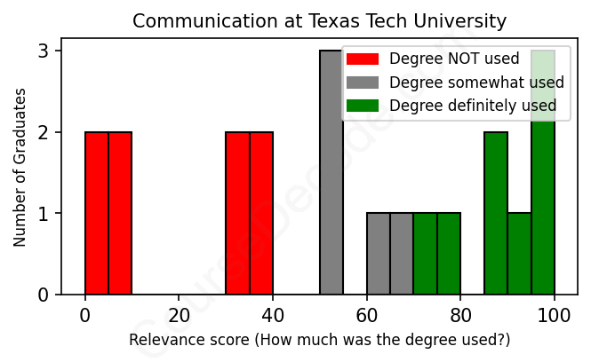 The verdict? Significantly below average. Overall, with an average relevance score of 54%, Communication graduates from Texas Tech University have a much lower likelihood (-13%) of finding work in this field compared to the average graduate across all fields: