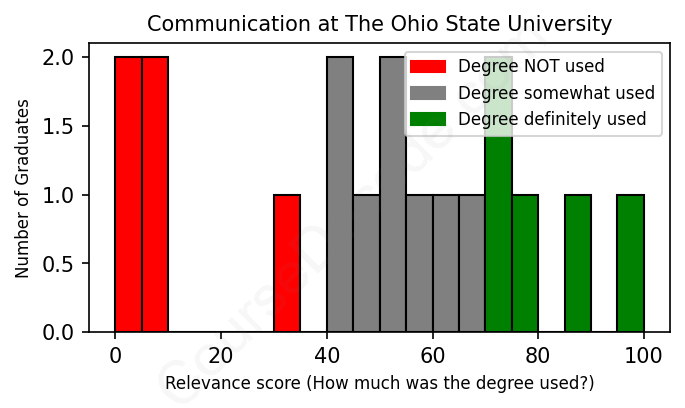 The verdict? Significantly below average. Overall, with an average relevance score of 48%, Communication graduates from The Ohio State University have a much lower likelihood (-19%) of finding work in this field compared to the average graduate across all fields: