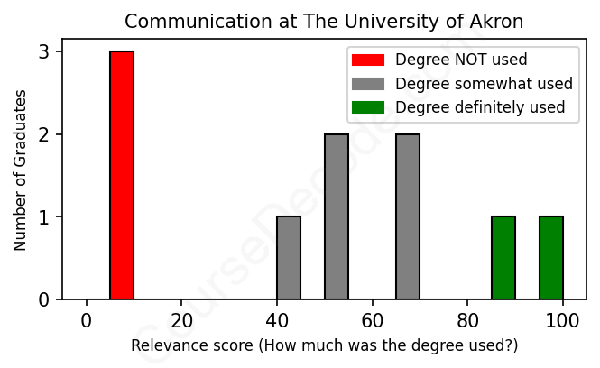 The verdict? Significantly below average. Overall, with an average relevance score of 48%, Communication graduates from The University of Akron have a much lower likelihood (-19%) of finding work in this field compared to the average graduate across all fields: