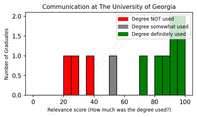 The verdict? Slightly above average. Overall, with an average relevance score of 68%, Communication graduates from The University of Georgia have a slightly higher likelihood (+1%) of finding work in this field compared to the average graduate across all fields:
