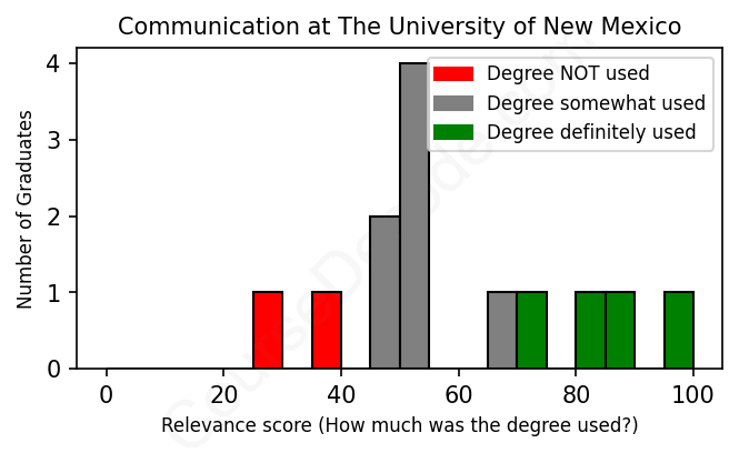 The verdict? Below average. Overall, with an average relevance score of 59%, Communication graduates from The University of New Mexico have a lower likelihood (-8%) of finding work in this field compared to the average graduate across all fields: