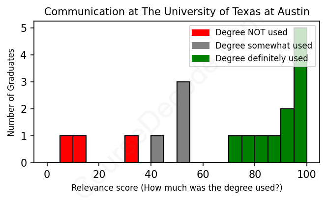 The verdict? Slightly above average. Overall, with an average relevance score of 69%, Communication graduates from The University of Texas at Austin have a slightly higher likelihood (+2%) of finding work in this field compared to the average graduate across all fields: