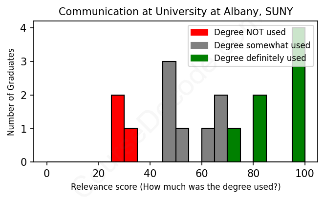 The verdict? Slightly below average. Overall, with an average relevance score of 65%, Communication graduates from University at Albany, SUNY have a slightly lower likelihood (-2%) of finding work in this field compared to the average graduate across all fields: