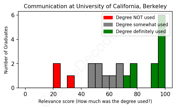 The verdict? Slightly above average. Overall, with an average relevance score of 69%, Communication graduates from University of California, Berkeley have a slightly higher likelihood (+2%) of finding work in this field compared to the average graduate across all fields: