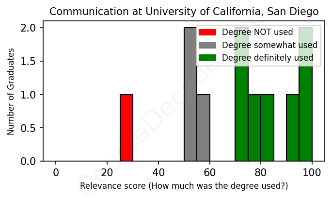 The verdict? Slightly above average. Overall, with an average relevance score of 70%, Communication graduates from University of California, San Diego have a slightly higher likelihood (+3%) of finding work in this field compared to the average graduate across all fields:
