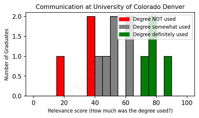 The verdict? Significantly below average. Overall, with an average relevance score of 54%, Communication graduates from University of Colorado Denver have a much lower likelihood (-13%) of finding work in this field compared to the average graduate across all fields: