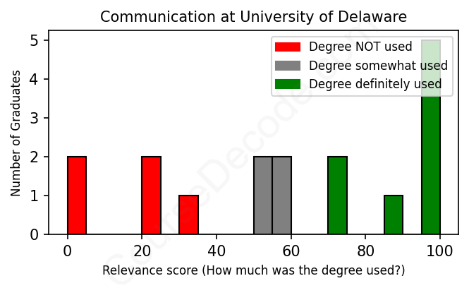 The verdict? Below average. Overall, with an average relevance score of 59%, Communication graduates from University of Delaware have a lower likelihood (-8%) of finding work in this field compared to the average graduate across all fields:
