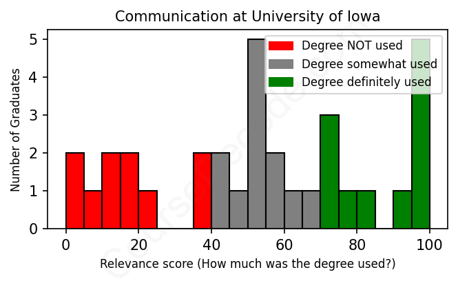 The verdict? Significantly below average. Overall, with an average relevance score of 52%, Communication graduates from University of Iowa have a much lower likelihood (-15%) of finding work in this field compared to the average graduate across all fields: