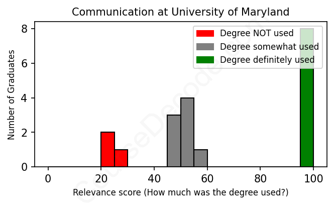 The verdict? On par with the average. Overall, with an average relevance score of 67%, Communication graduates from University of Maryland have about the same likelihood of finding work in this field as the average graduate across all fields: