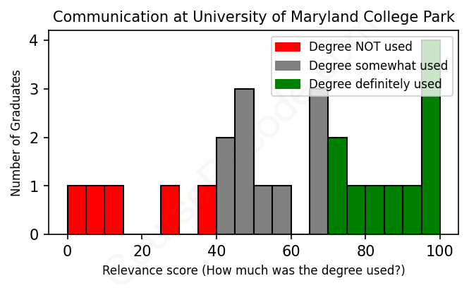 The verdict? Below average. Overall, with an average relevance score of 60%, Communication graduates from University of Maryland College Park have a lower likelihood (-7%) of finding work in this field compared to the average graduate across all fields: