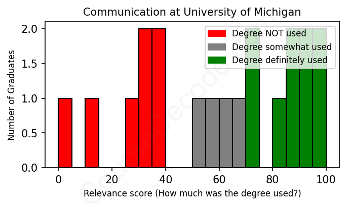 The verdict? Below average. Overall, with an average relevance score of 59%, Communication graduates from University of Michigan have a lower likelihood (-8%) of finding work in this field compared to the average graduate across all fields: