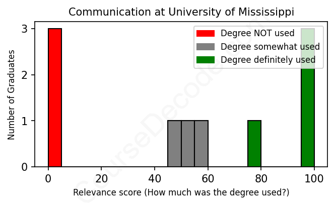 The verdict? Significantly below average. Overall, with an average relevance score of 52%, Communication graduates from University of Mississippi have a much lower likelihood (-15%) of finding work in this field compared to the average graduate across all fields: